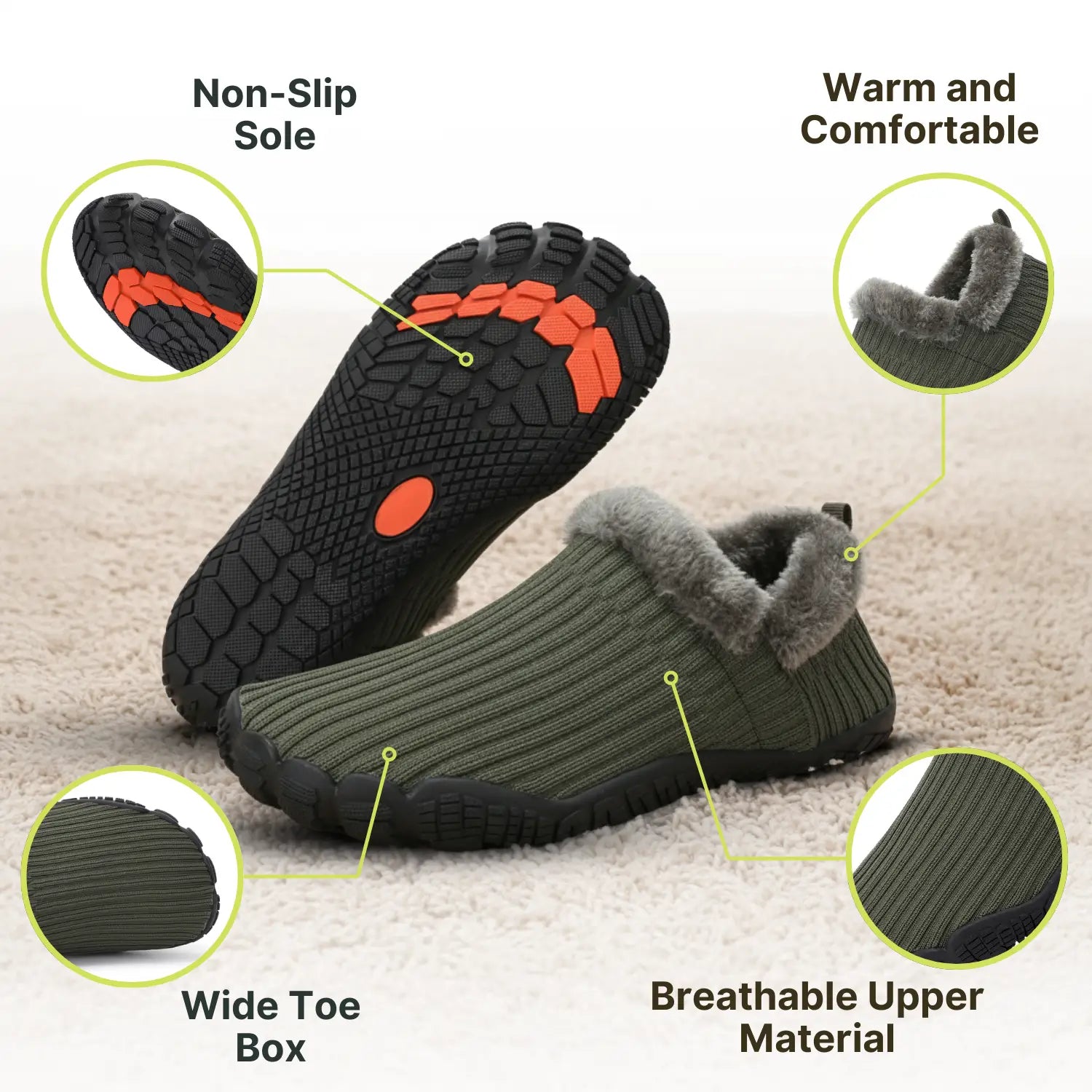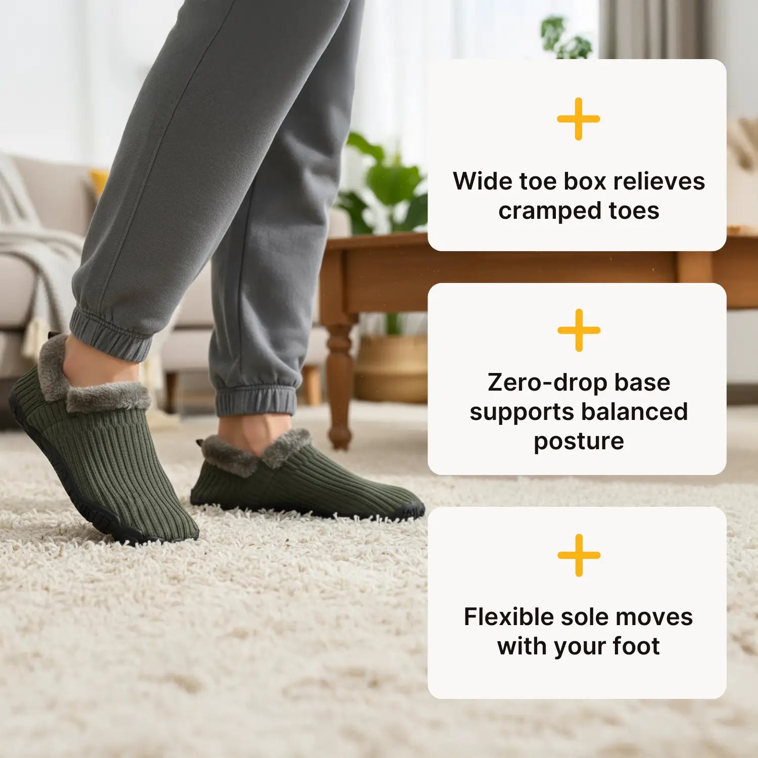 Built like a barefoot shoe, not a floppy slipper. A wide toe box lets your toes relax and spread naturally, the zero-drop base supports balanced posture, and a flexible, grippy rubber sole gives you confident footing on tile, wood, and quick steps outside to the bins or mailbox. Indoor comfort, outdoor-ready practicality for everyday wear.